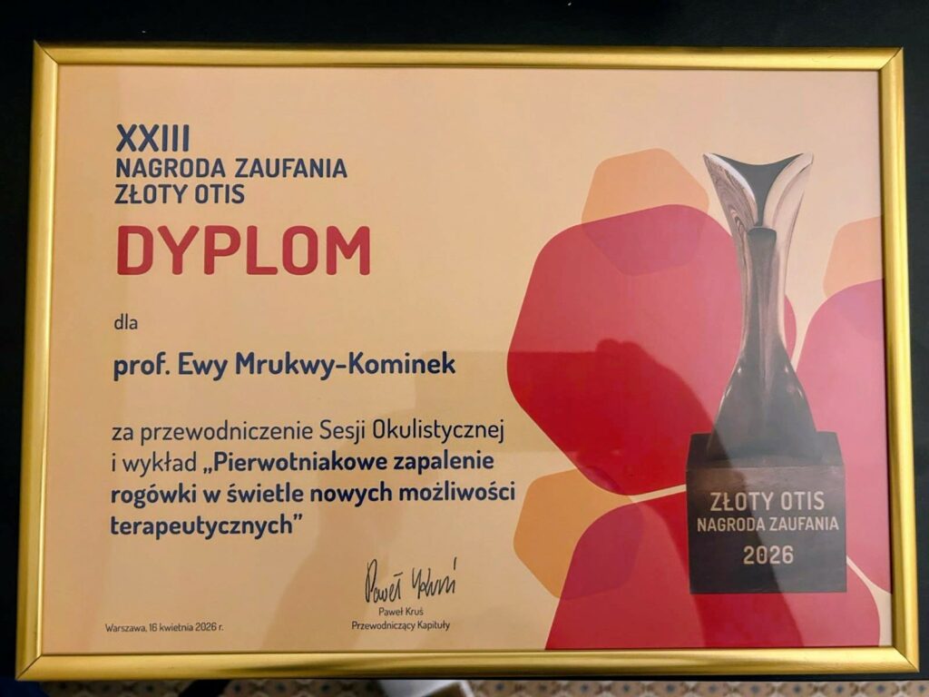 Z przyjemnością informujemy, że prof. Ewa Mrukwa-Kominek otrzymała dyplom za przewodniczenie sesji „Okulistyka 2026” oraz wykład pt. „Pierwotne zapalenie rogówki w świetle nowych możliwości terapeutycznych”.